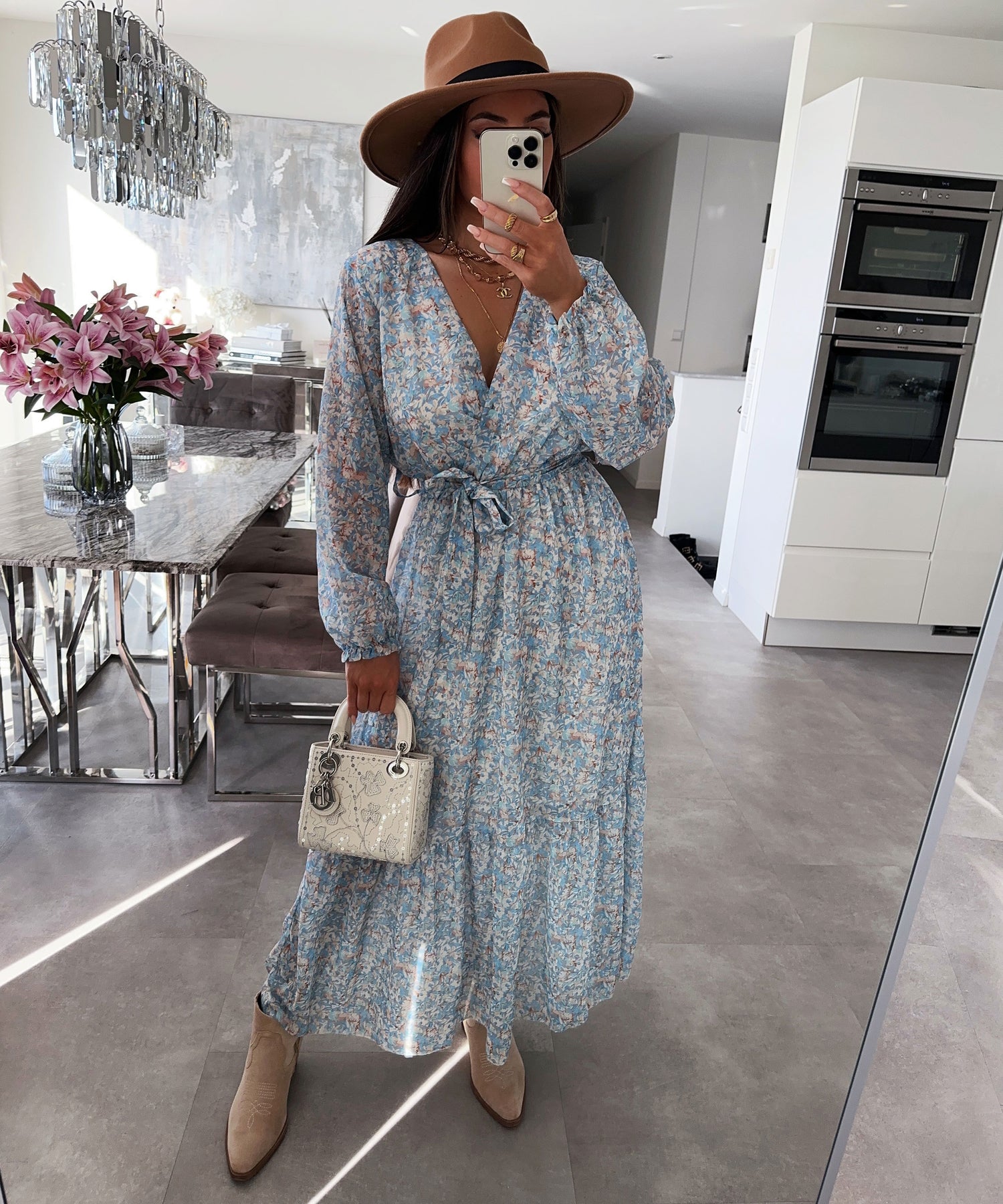 Super schönes Maxi Kleid mit Blumenmuster und Bindegürtel zum Taillieren. Model ist 1,65m groß. Gesamtlänge: ca. 127cm