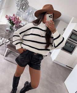 Beige mit dunkelbraunen Streifen. Einheitsgröße passt XS-L. Angenehmer Stoff. Model ist 1.65m groß und trägt regulär Größe S (36).