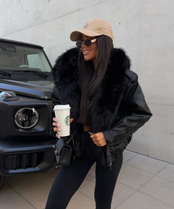 Super bequeme oversize Kunstlederjacke mit weichem Innenfutter sowie tollem Kunstpelzkragen. Fell abnehmbar. Fällt normal aus. Model eins ist 1,63m groß und trägt Größe S.