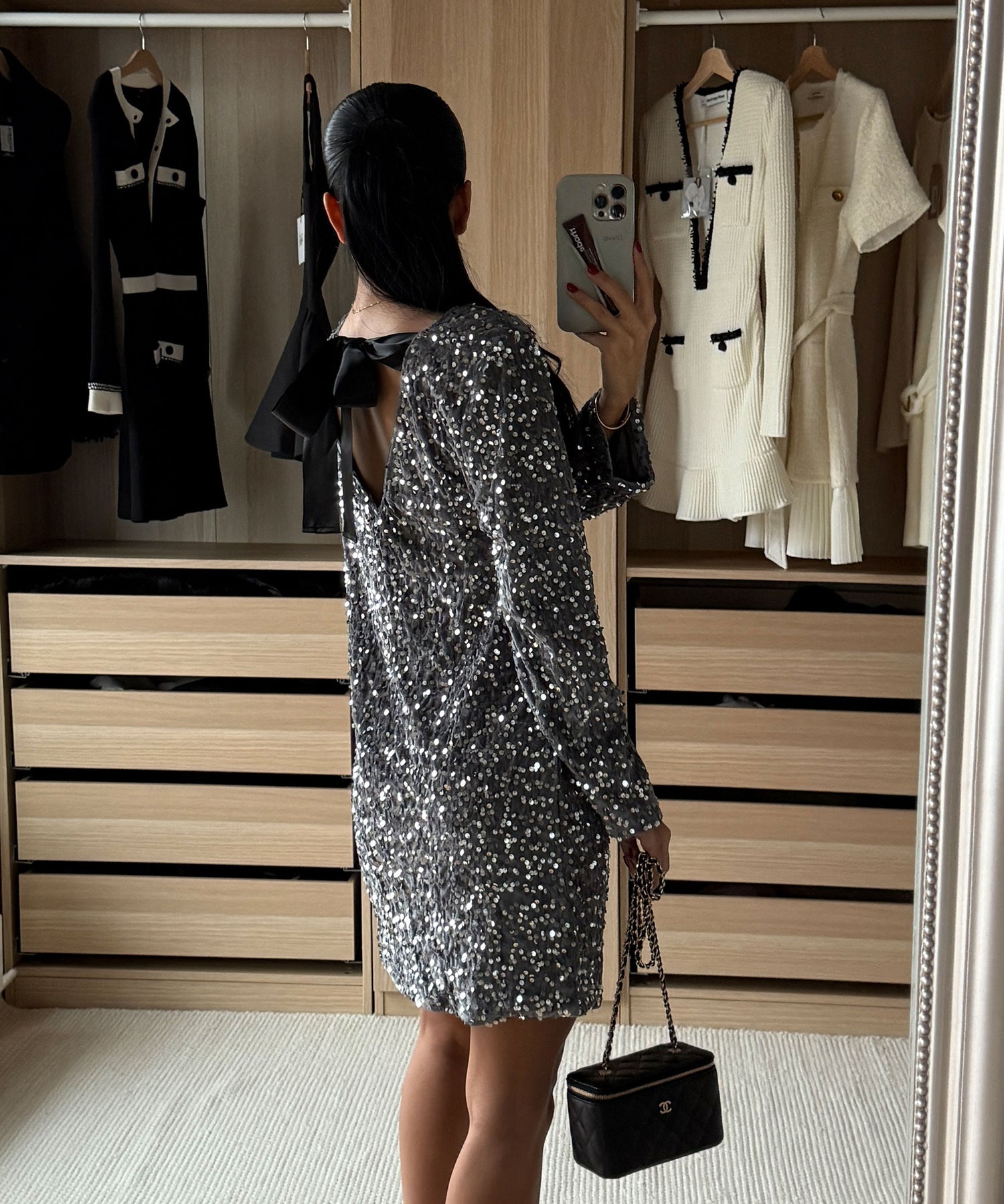 Paillettenkleid mit Schleife. Fällt normal aus. Model eins ist 1,60m groß und trägt Größe SM. model zwei ist 1,65m und trägt Größe SM.