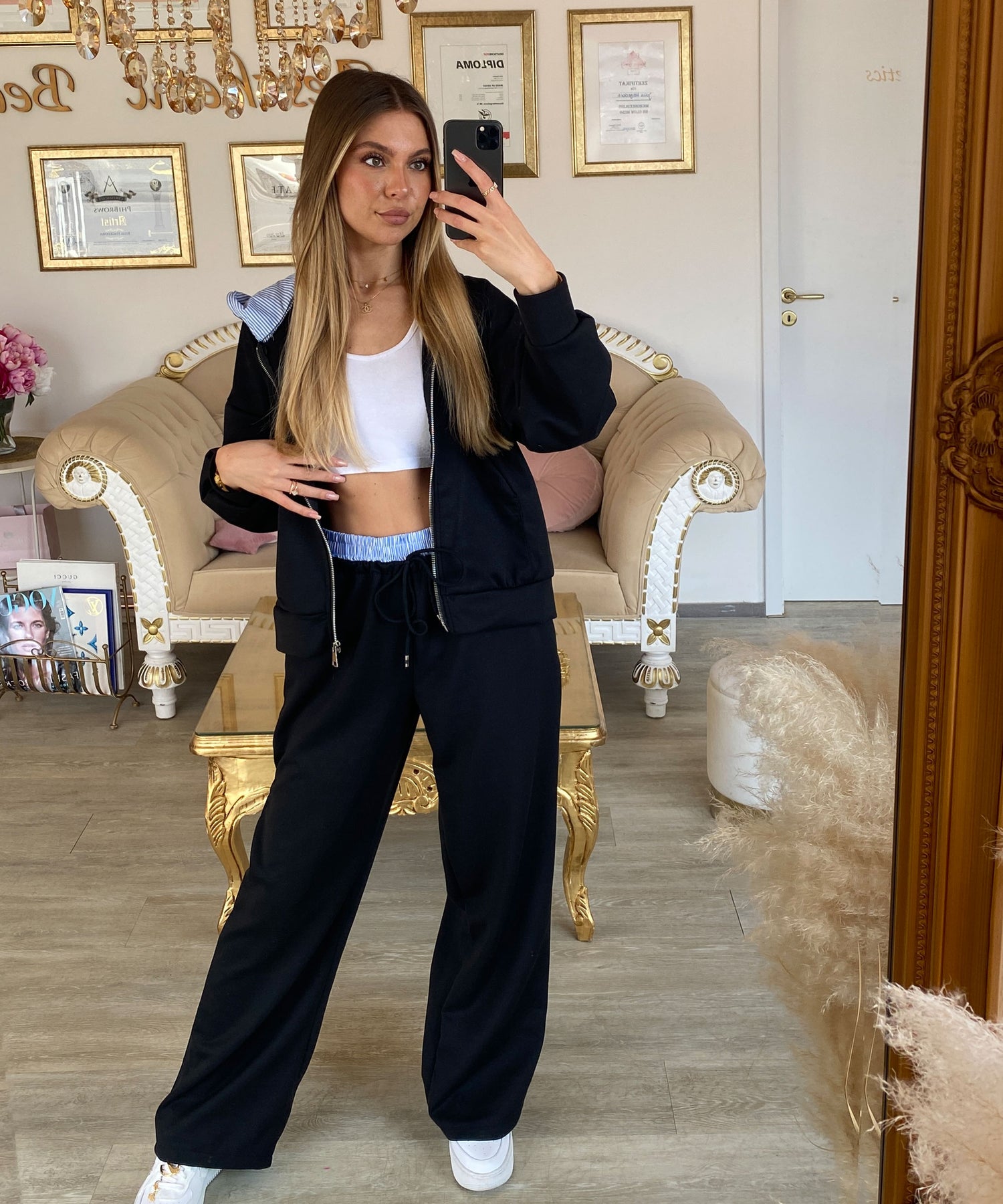 Set mit eingenähten Hemddetails. Passt den Größen XS-L. Model ist 1,65m groß.