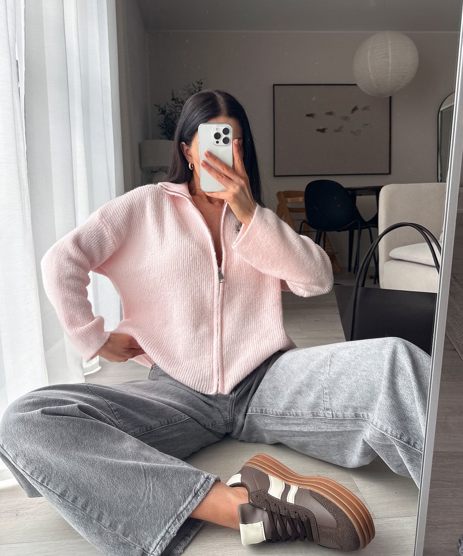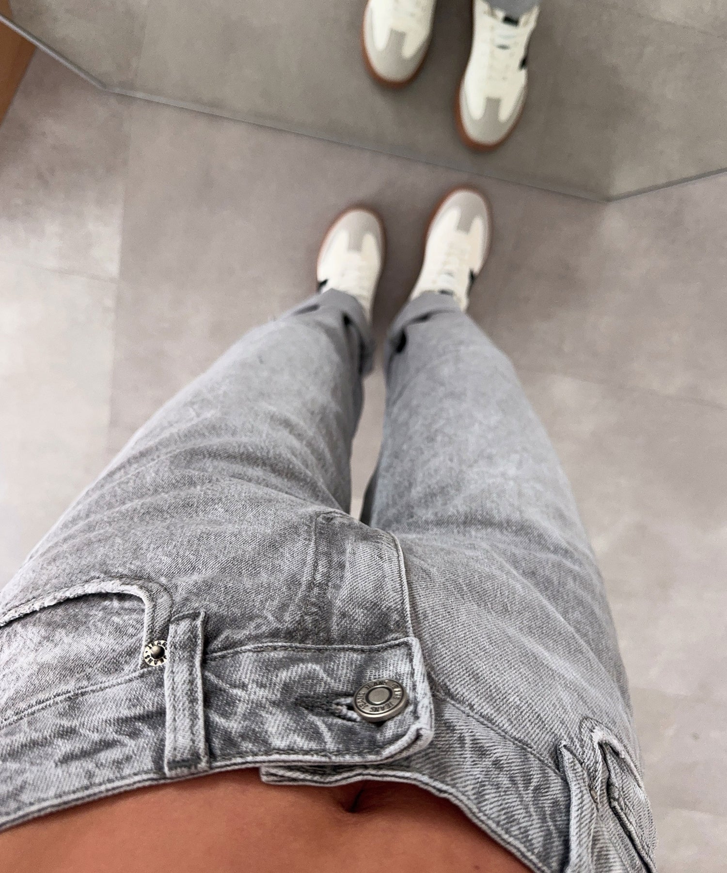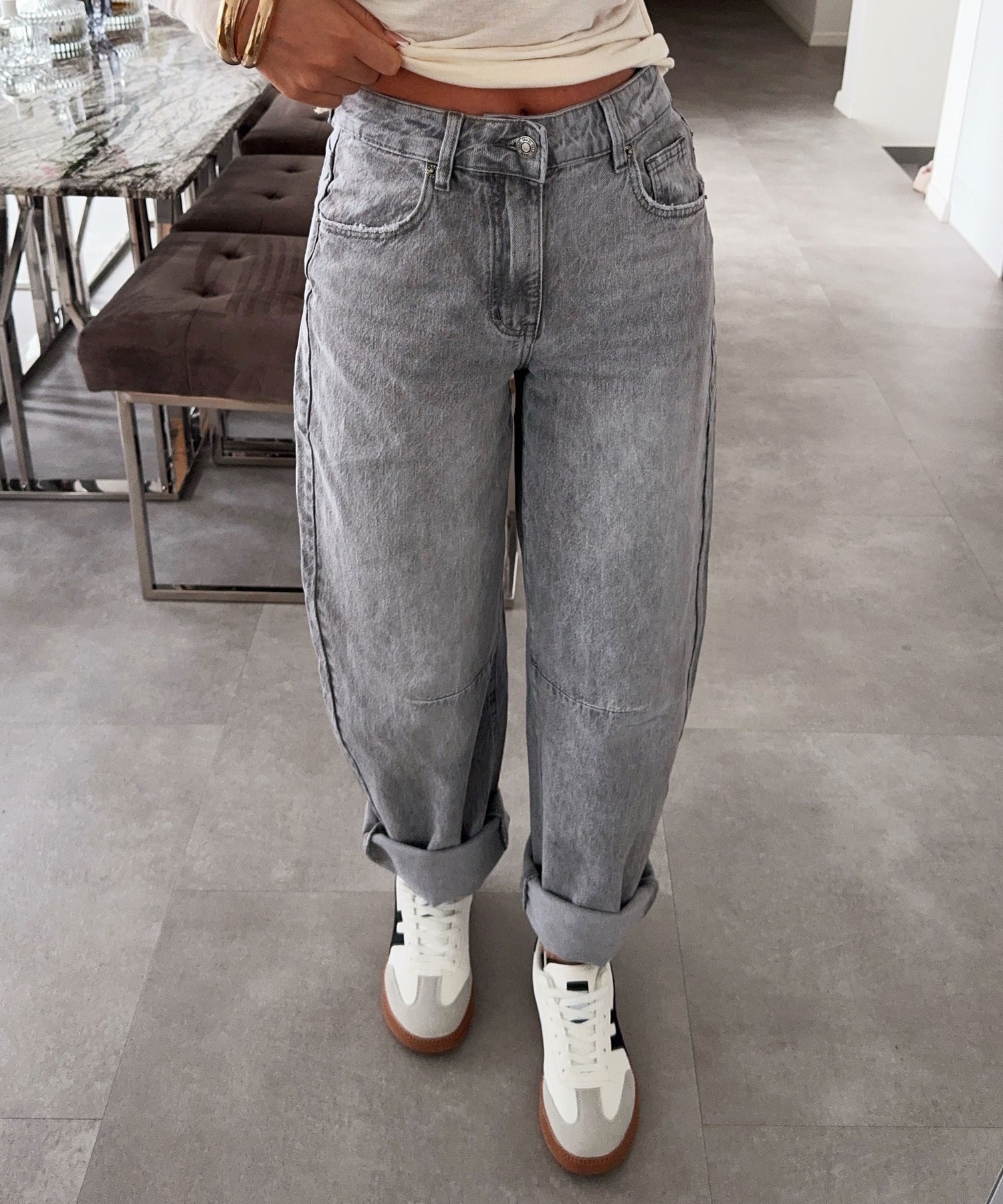 Fällt normal aus. Enthält viel Stretch und ist daher super bequem. Model ist 1,65m groß und trägt Größe S. Model zwei ist 1,68m und trägt Größe S. Kann man normal oder hochgekrempelt getragen werden.