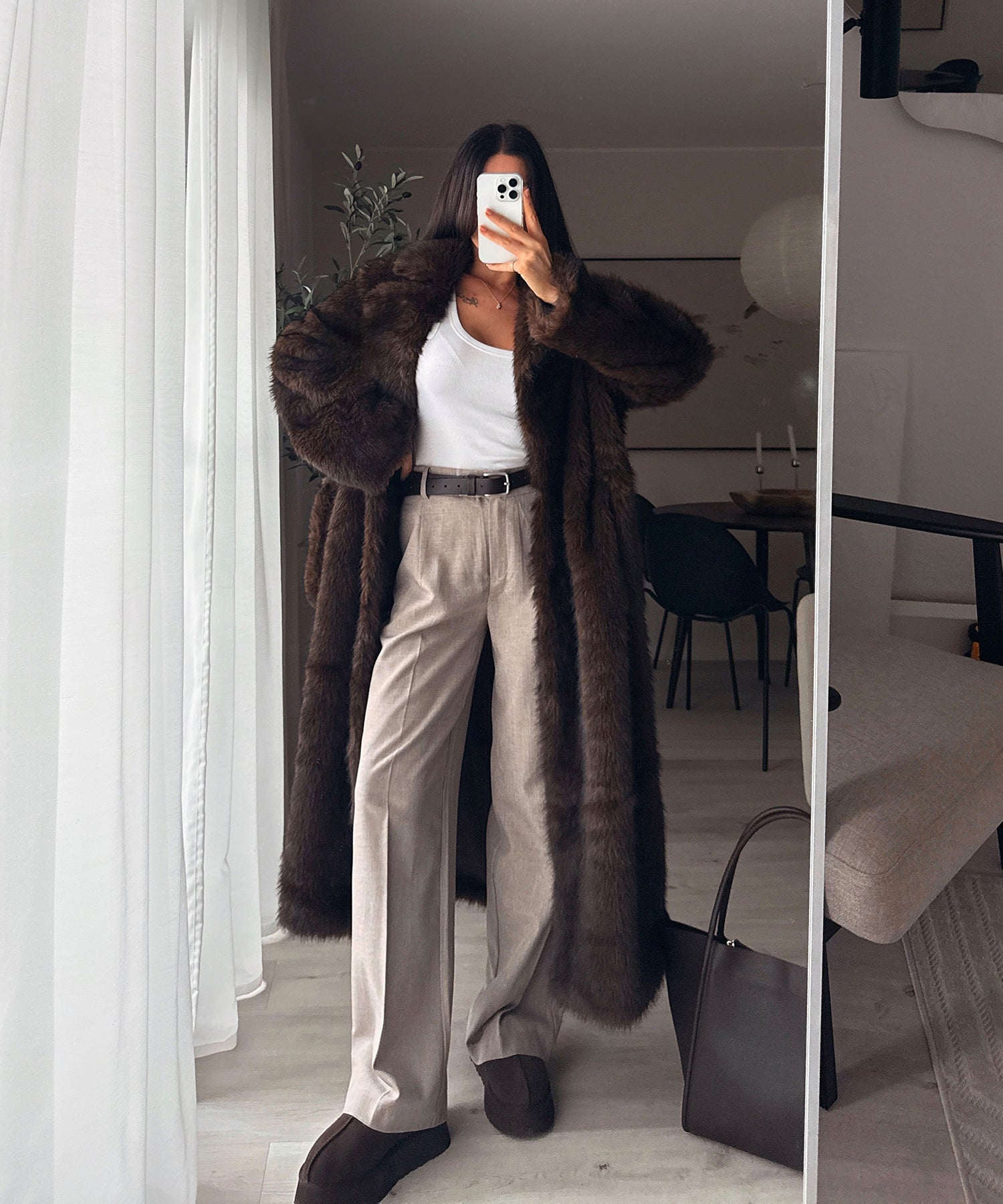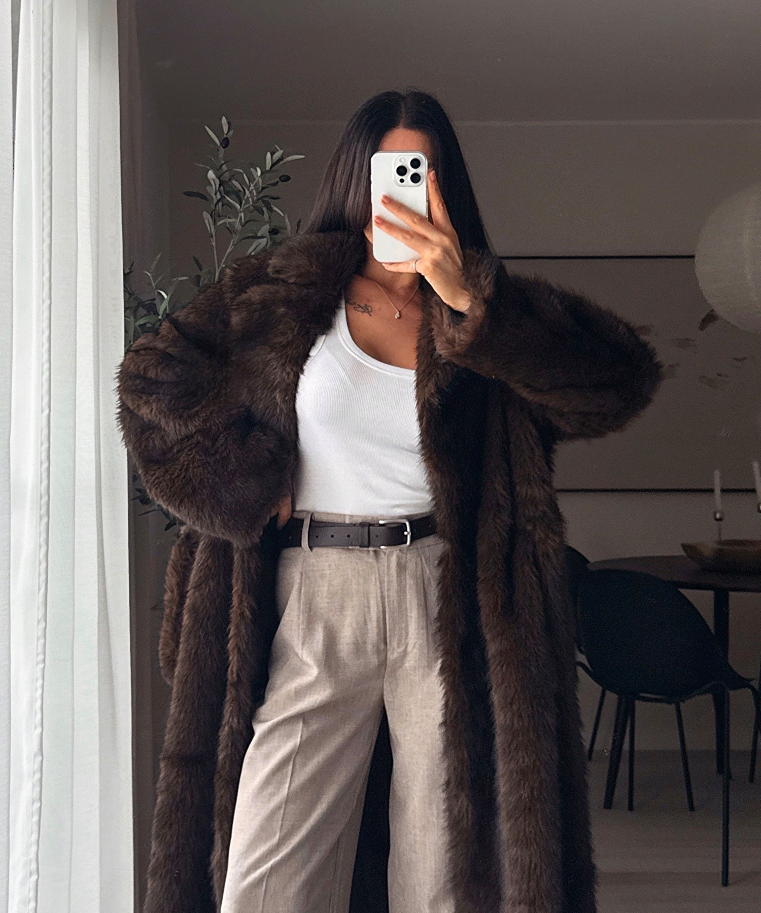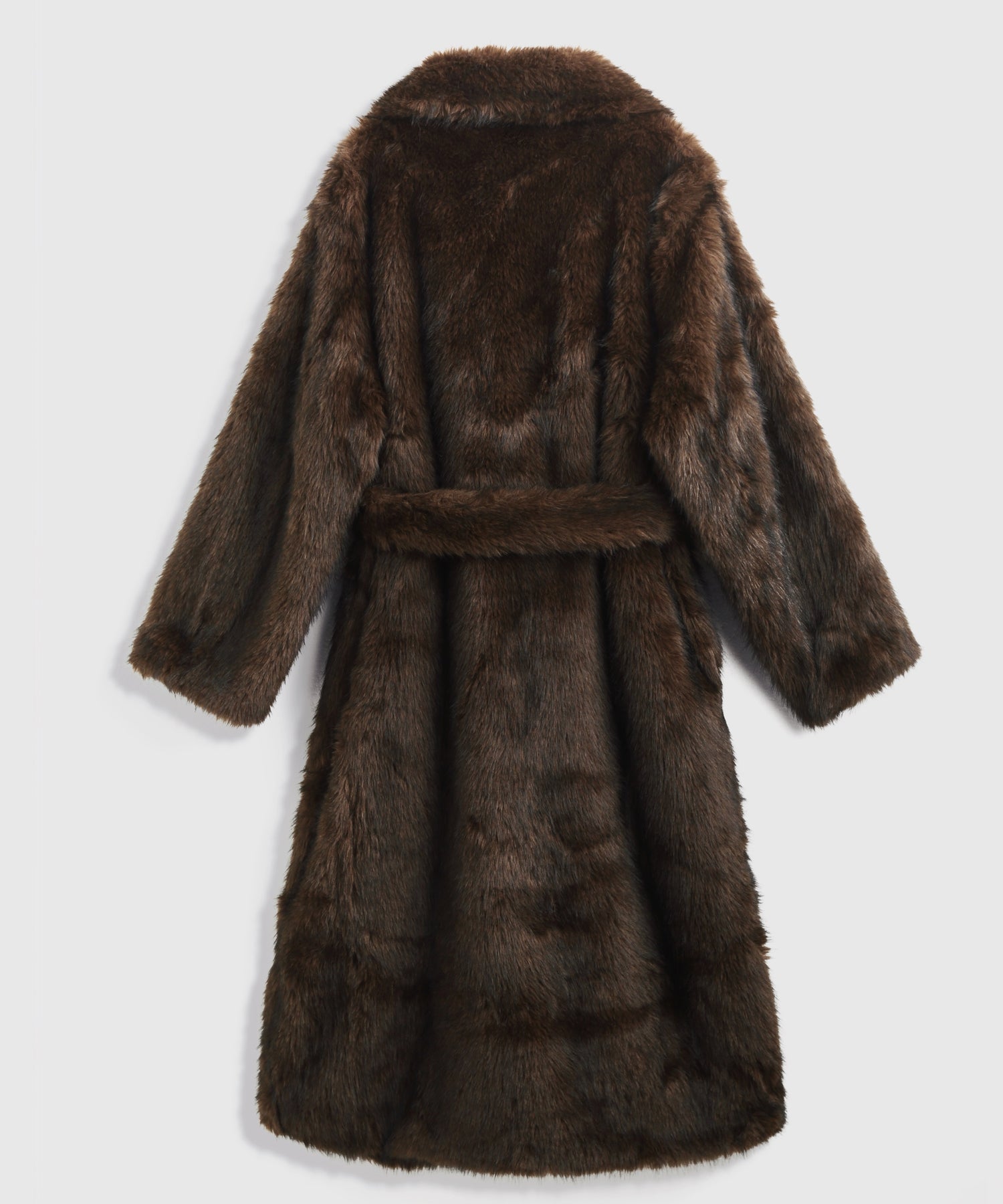 Pelzmantel mit Pelzgürtel. Fällt normal aus. Model ist 1,68m und trägt Größe SM.