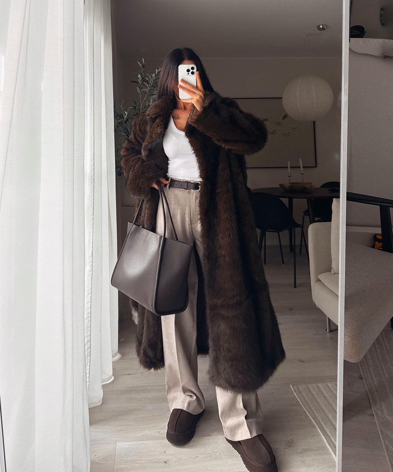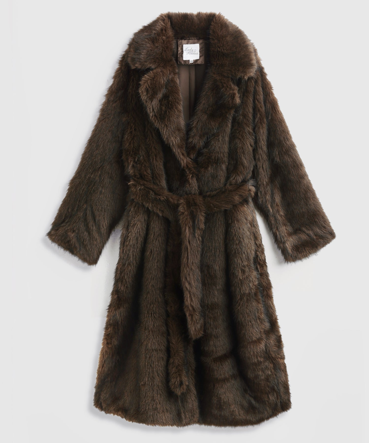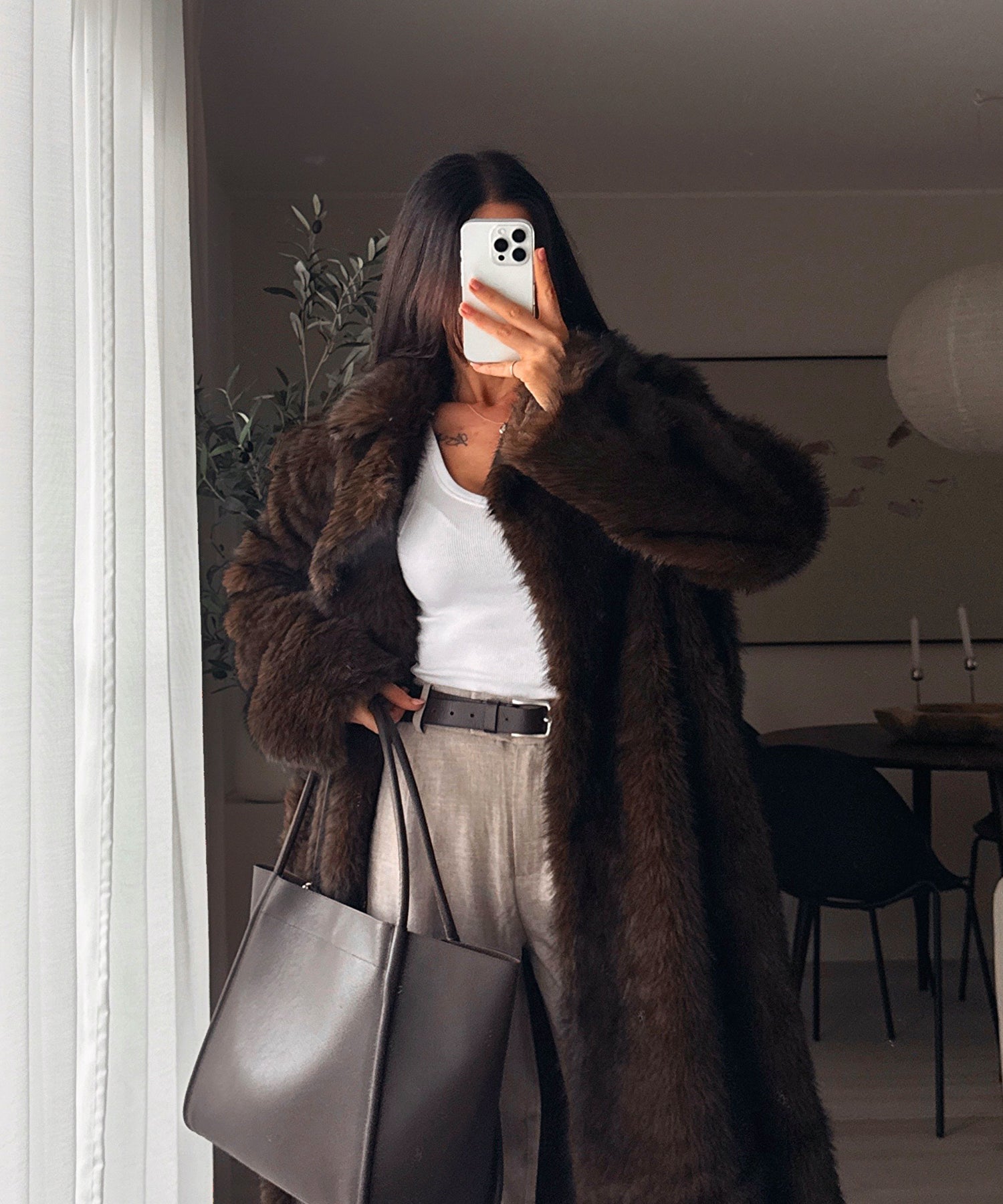 Pelzmantel mit Pelzgürtel. Fällt normal aus. Model ist 1,68m und trägt Größe SM.