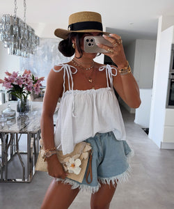 Musselin Top aus 100% Baumwolle. Super dehnbar. Passt den Größen XS-XL. Model ist 1,65m groß.