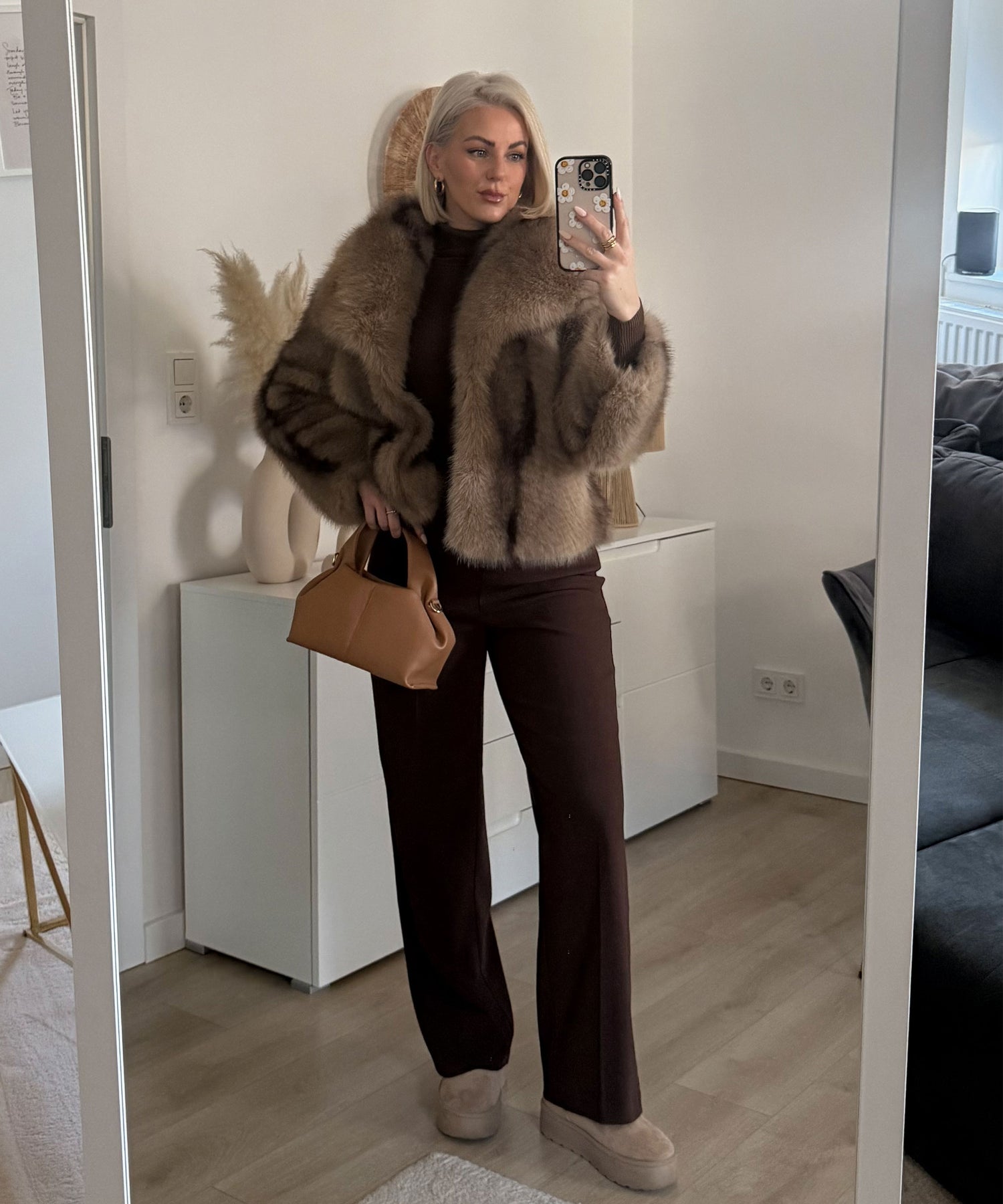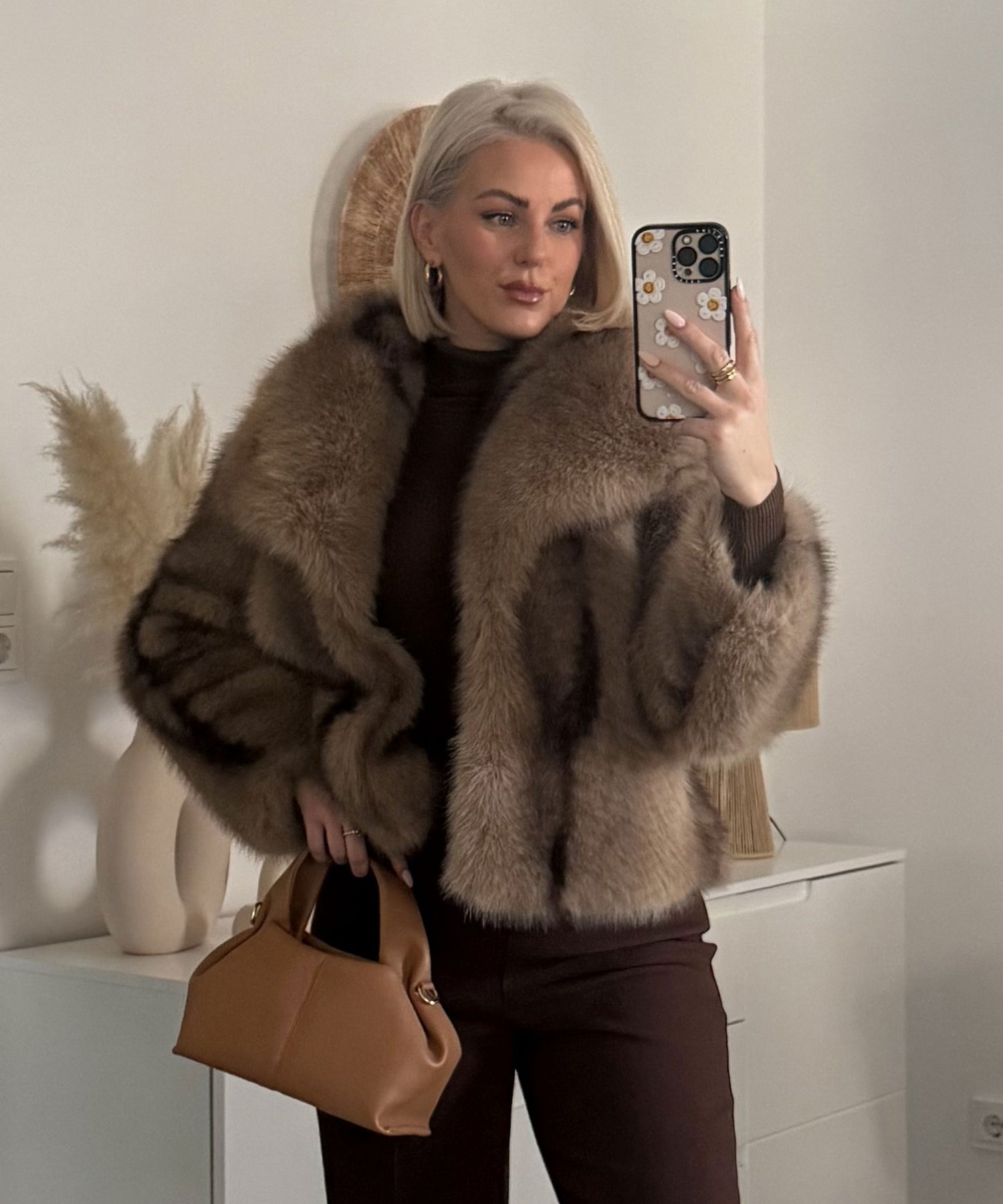 Fällt normal aus. SM und ML haben keinen großen Unterschied. Model eins ist 1.69m und trägt Größe SM. Super weiche Kunstpelzjacke mit Handtaschen und Druckknöpfen.