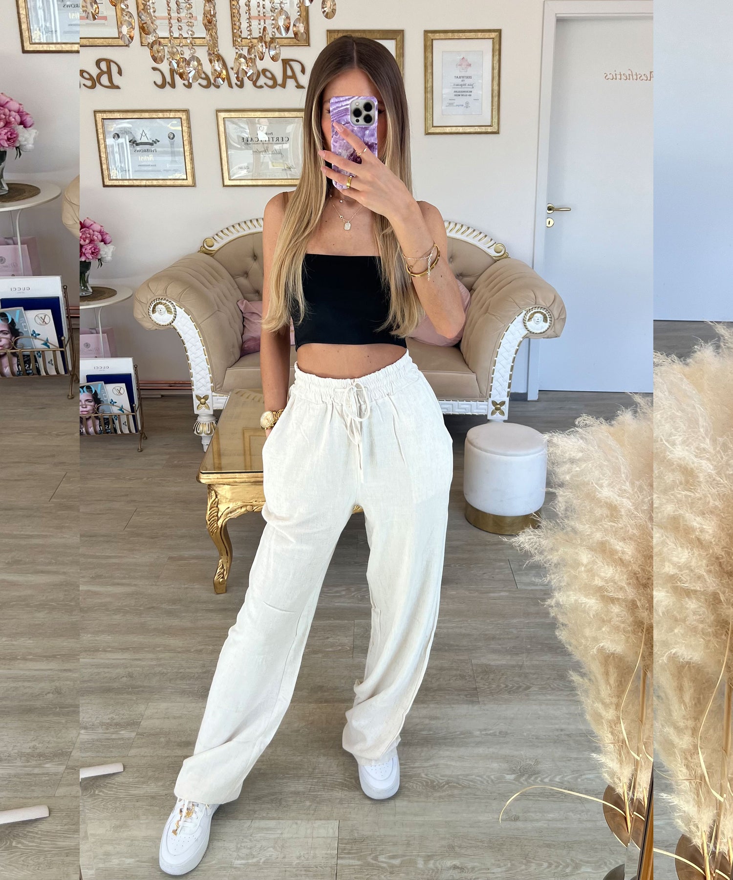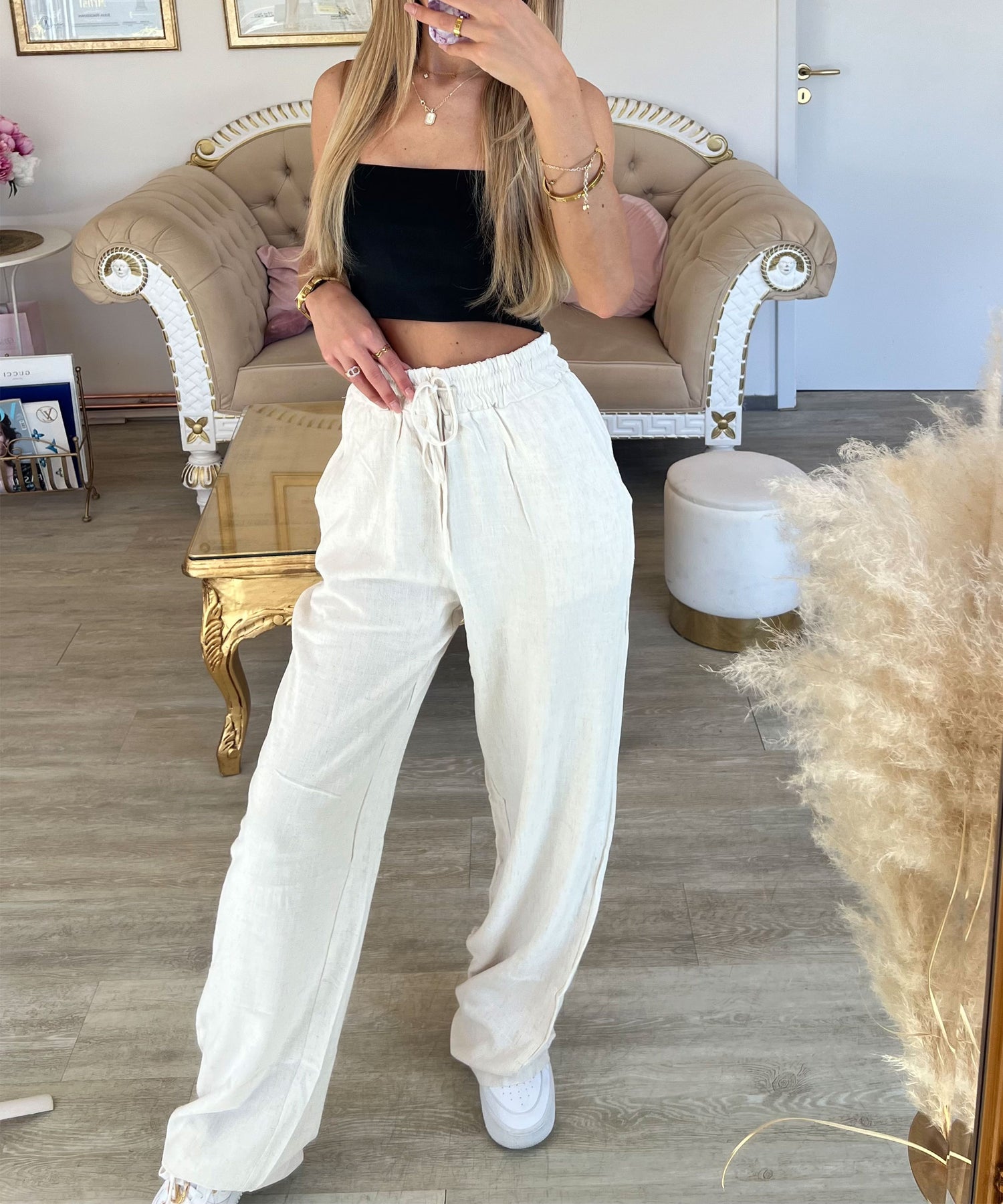 Hose aus Leinen komplett blickdicht. Model ist 1,65m groß und trägt Größe SM durch den Gummibund würde ihr auch ML passen.