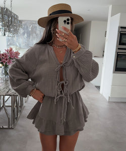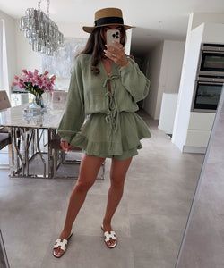 Schöner Musselin Einteiler aus 100% Baumwolle mit integrierter Hose und dehnbarem Gummibund. Einheitsgröße passt den Größen XS-L. Model eins ist 1.69m groß. Model zwei ist 1.65m.