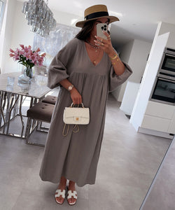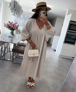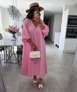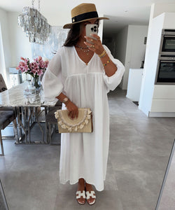 Musselin Kleid aus 100% Baumwolle. Model ist 1,65m groß. Passt XS-XXL. Mit Gummibund and den Ärmeln, sodass sie langarm als auch hochgerafft getragen werden können.