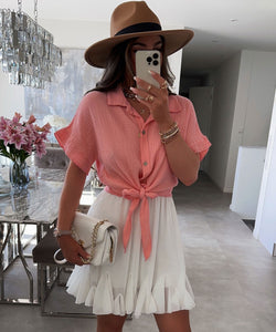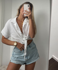 Super angenehmes Musselin T-Shirt mit Knoten aus 100% Baumwolle. Einheitsgröße passt den Größen XS-L. Model ist 1,65m groß.