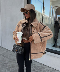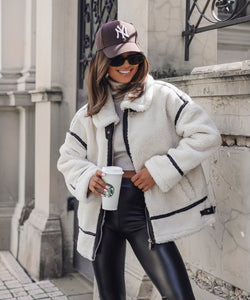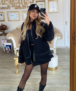 Super schöne Bikerjacke mit Teddyfell. Model ist 1,65m groß und trägt Größe SM.