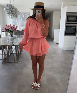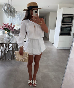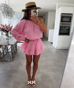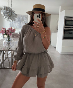Schöner Musselin Einteiler aus 100% Baumwolle mit integrierter Hose und dehnbarem Gummibund. Einheitsgröße passt den Größen XS-L. Model eins ist 1.69m groß. Model zwei ist 1.65m.
