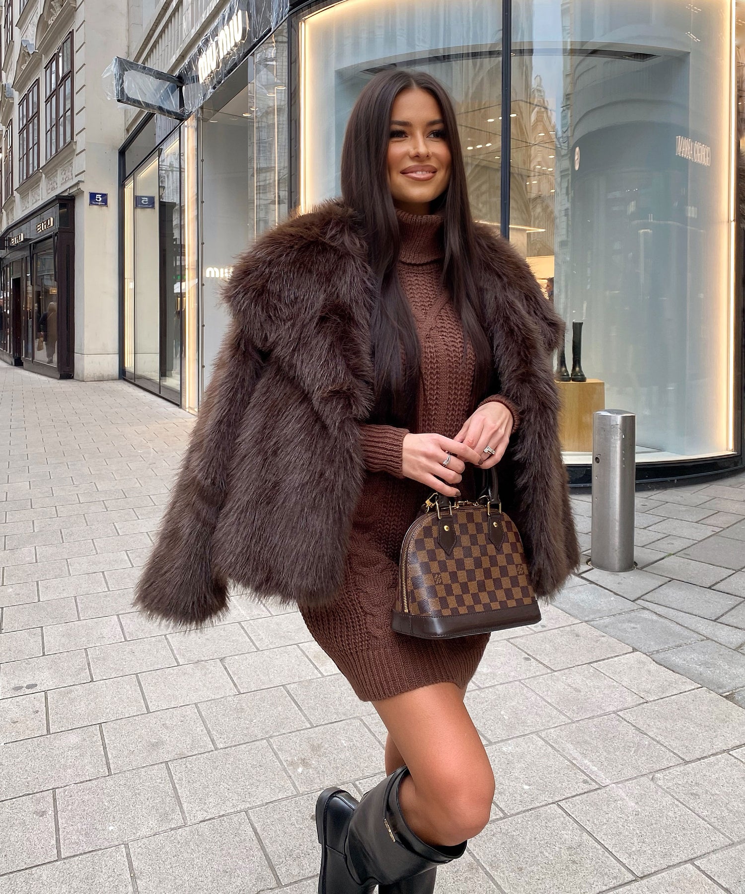 Fällt normal aus. SM und ML haben keinen großen Unterschied. Model eins ist 1.69m und trägt Größe SM. Super weiche Kunstpelzjacke mit Handtaschen und Druckknöpfen.
