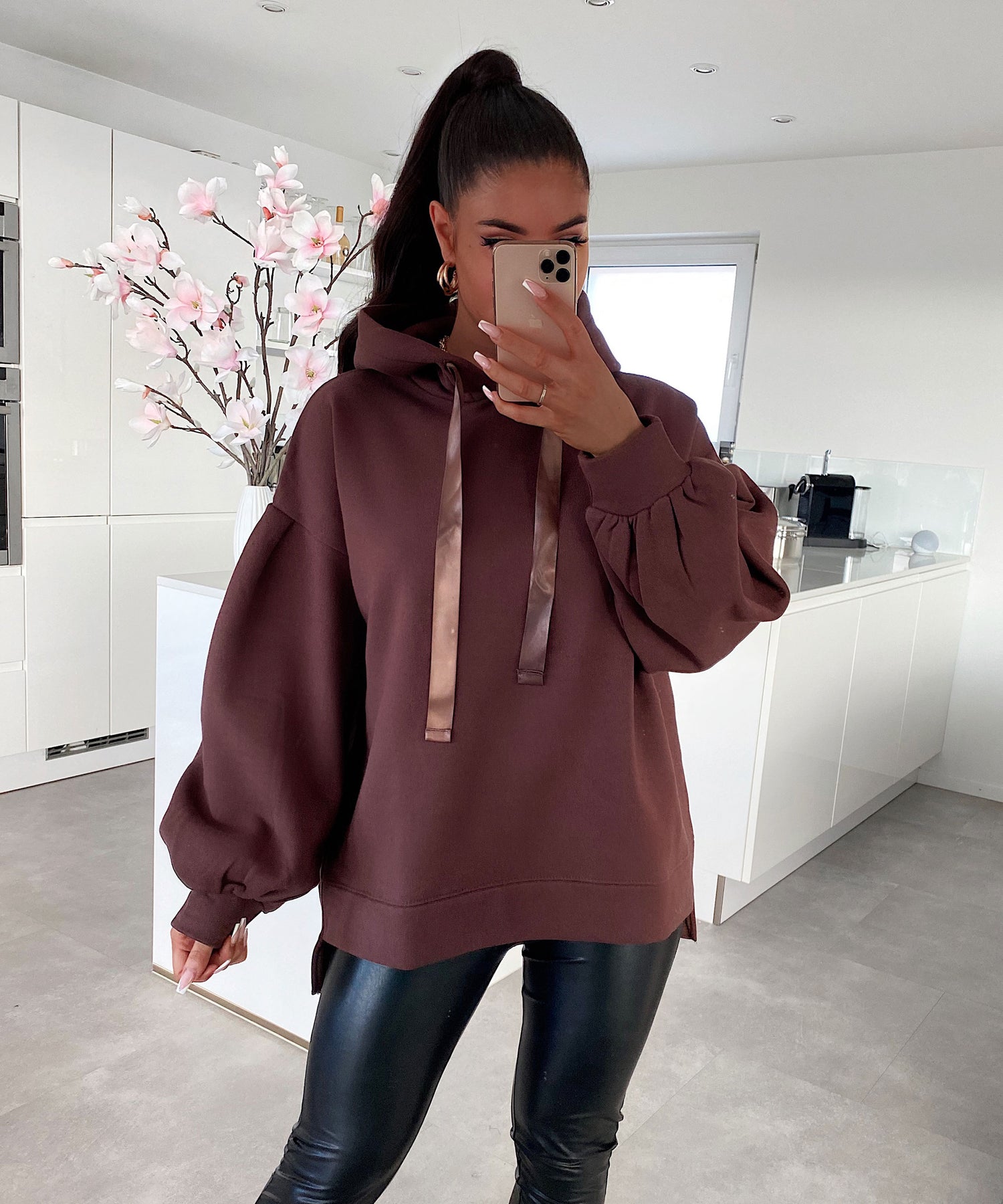 Super weicher, gefütterter Hoodie mit Ballonärmeln. Einheitsgröße passt XS-XL. Model eins ist 1.65m. Model zwei ist 1.69m.