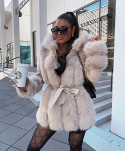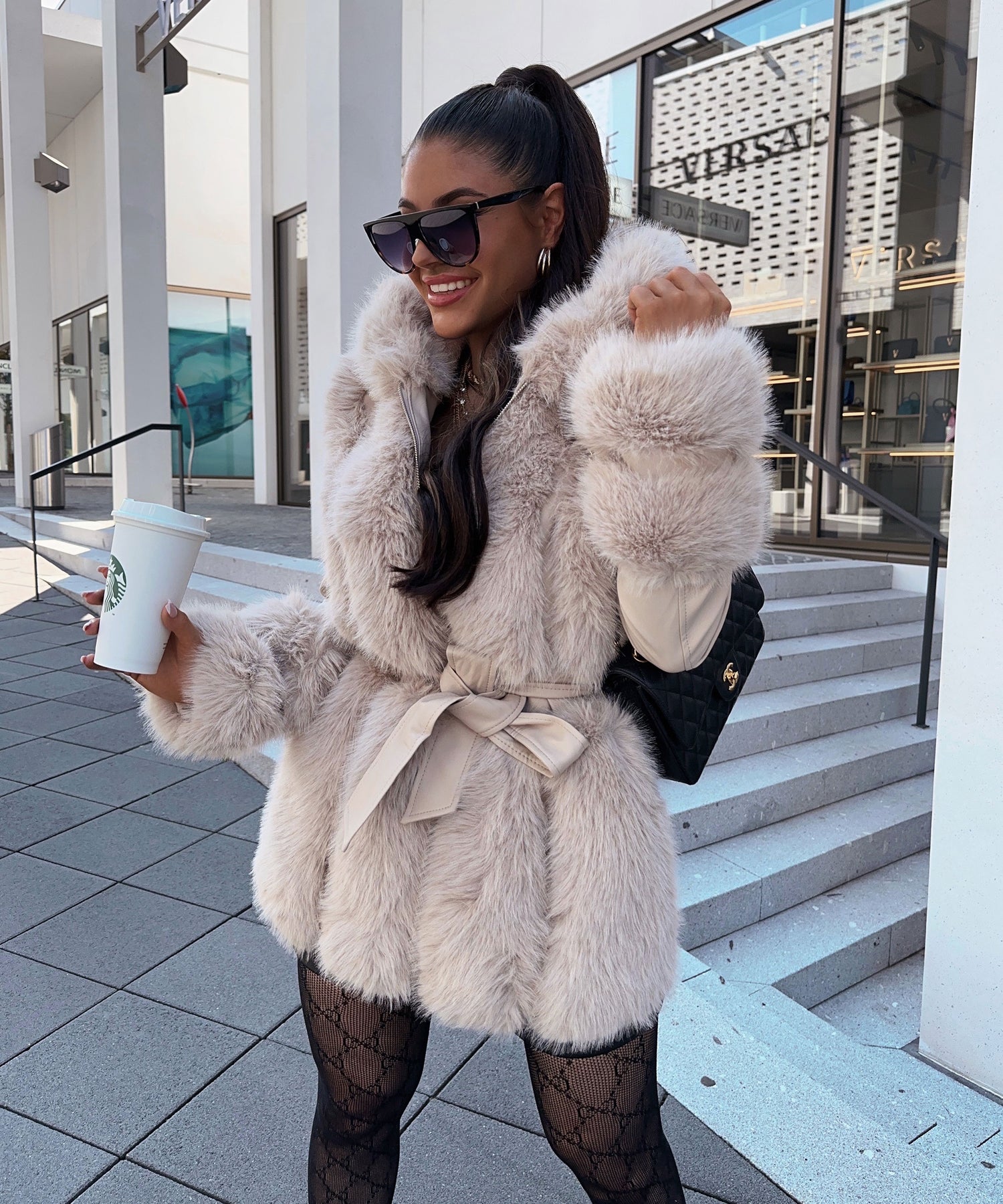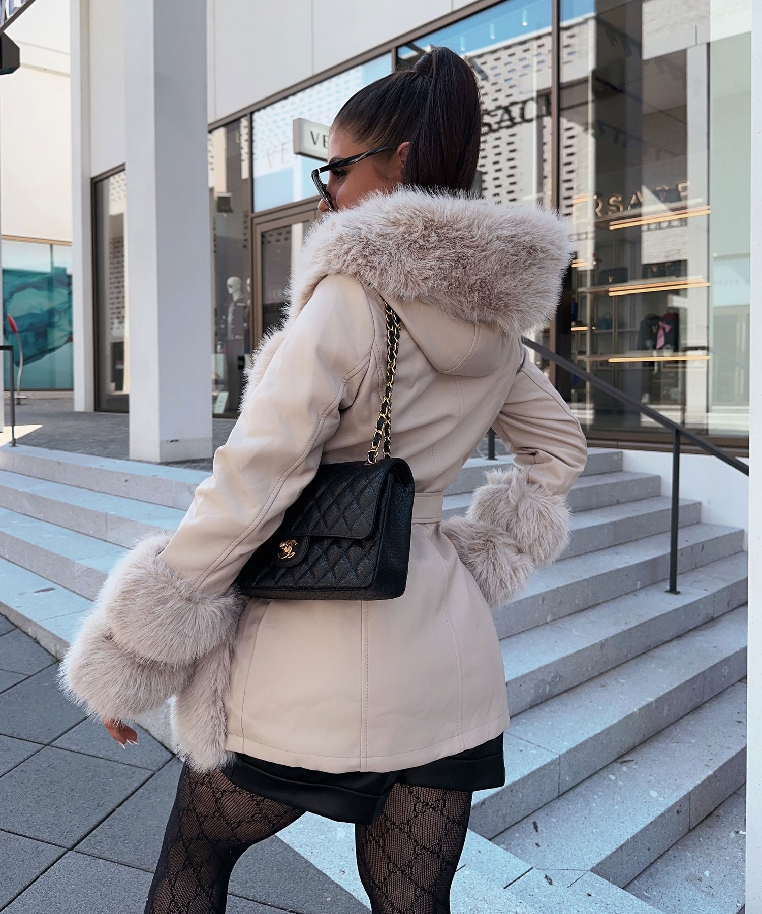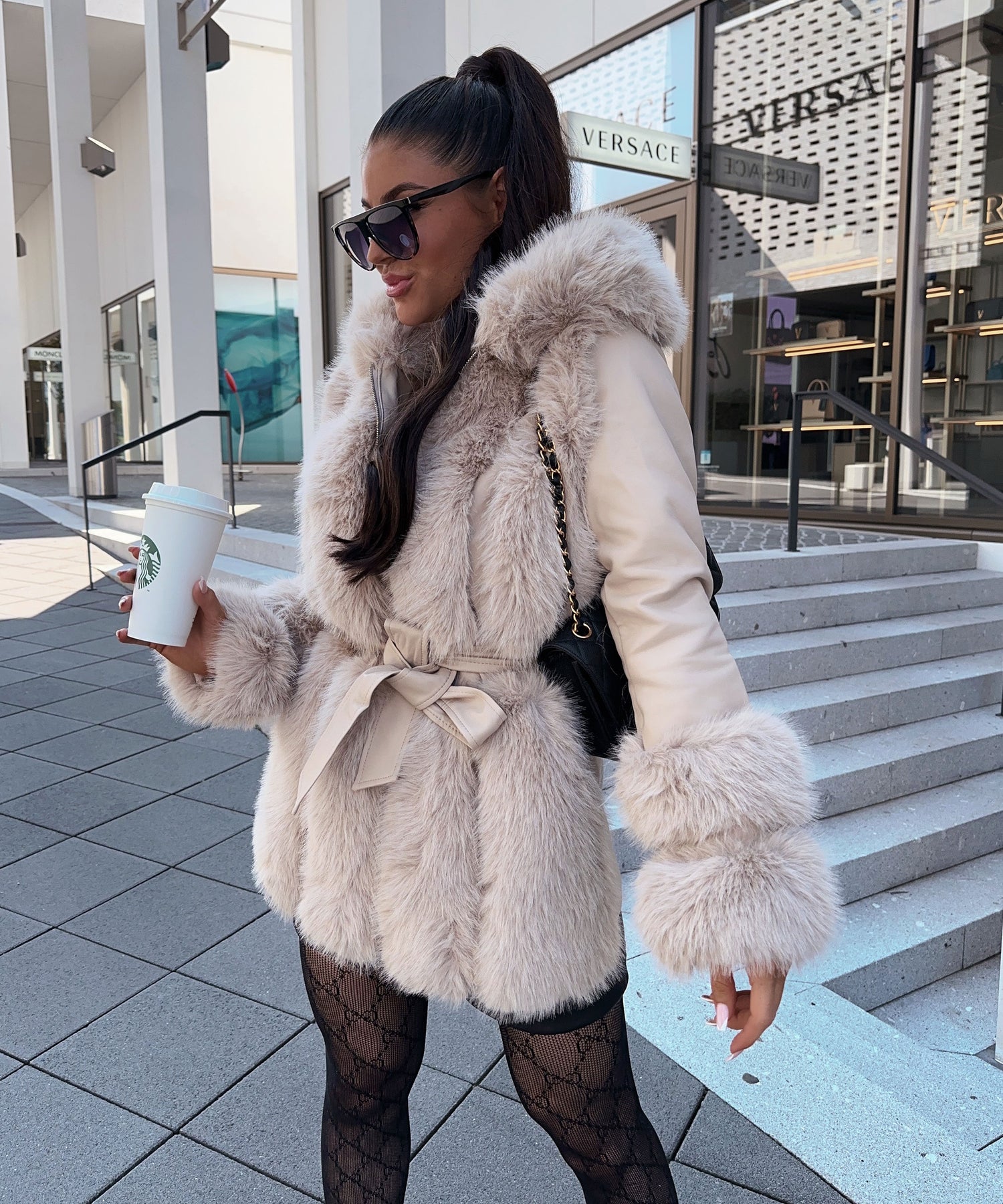 Super schöne Kunstpelzjacke mit Gürtel zum binden und Reißverschluss. Model ist 1,65m groß und trägt Größe S. Hält durch den Pelz am Hals schön warm.
