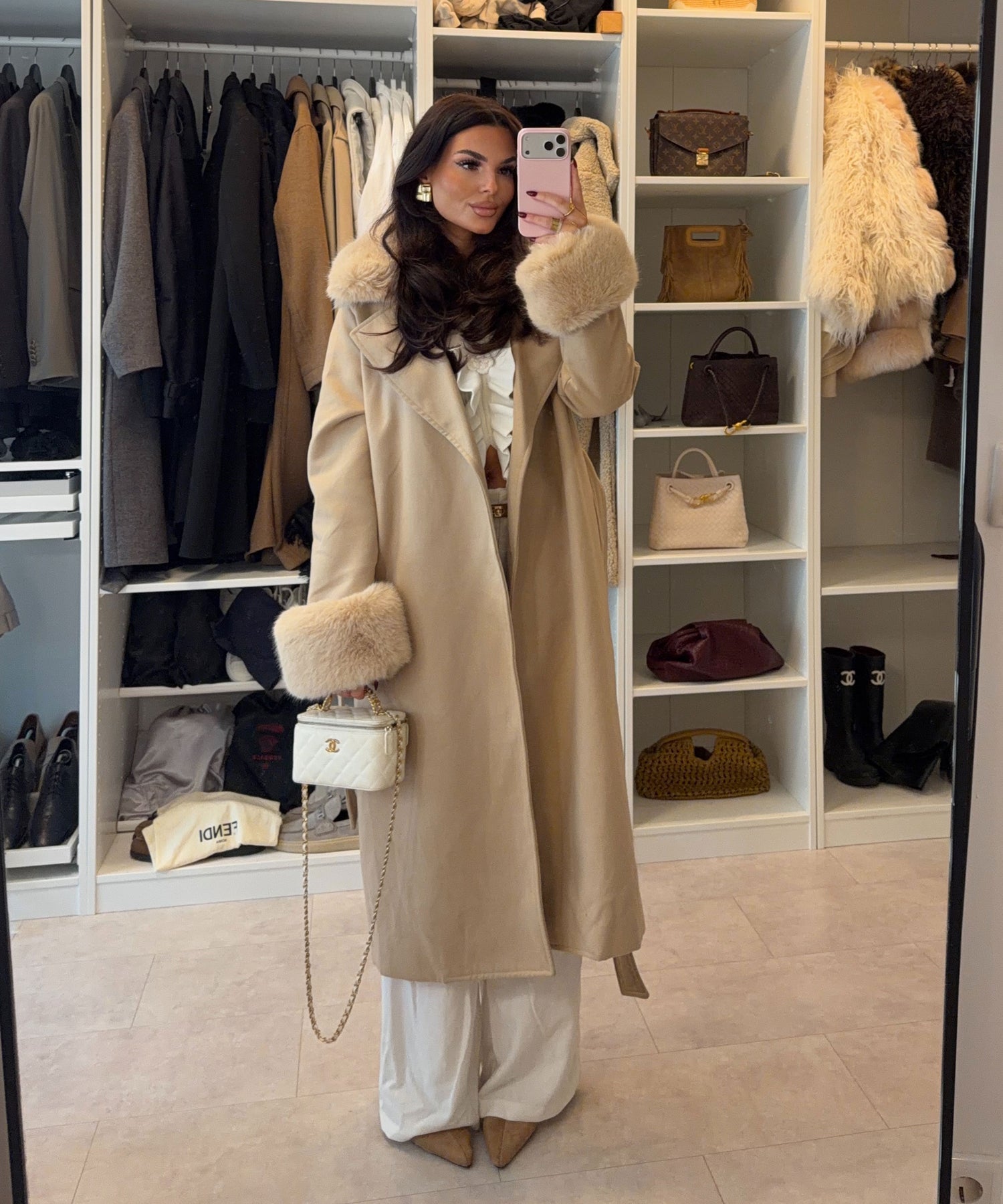Super schöner Mantel mit tollem Kunstfell für einen eleganten Look. Fell ist abnehmbar. Durch den Bindegürtel kann der Mantel tailliert werden. Model eins ist 1,69m groß und trägt Größe SM. Model zwei ist 1,65m und trägt Größe SM.
