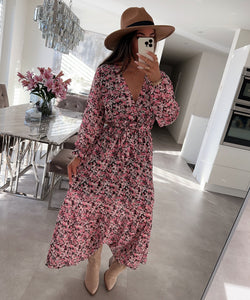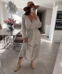 Super schönes Maxi Kleid mit Blumenmuster und Bindegürtel zum Taillieren. Model ist 1,65m groß. Gesamtlänge: ca. 127cm