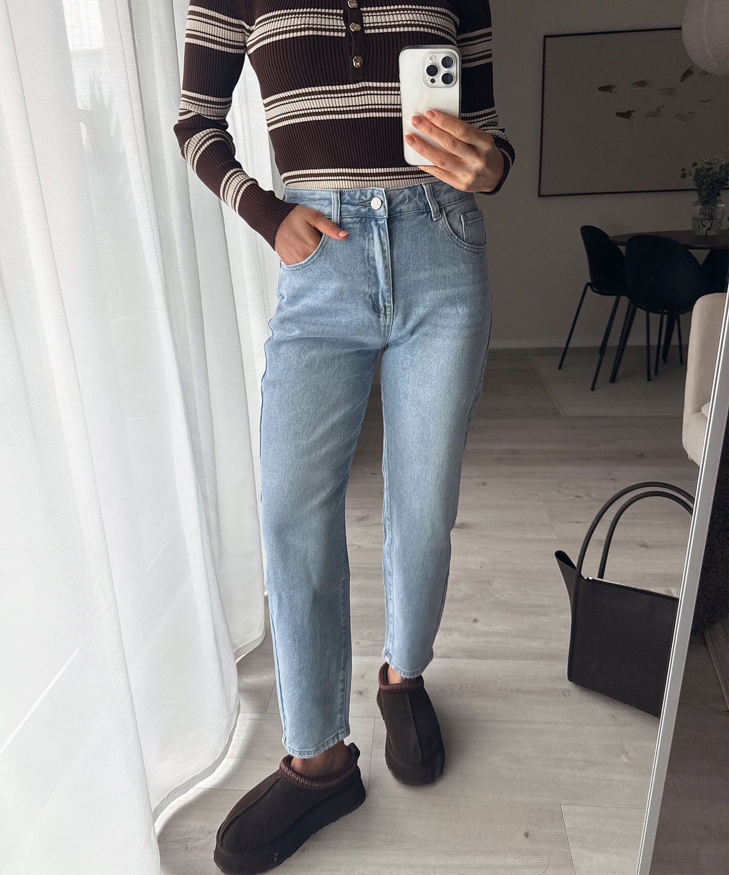 Jeans aus Baumwolle. Fällt normal aus und enthält viel Stretch. Daher ist sie super bequem. Model ist 1,68m groß.