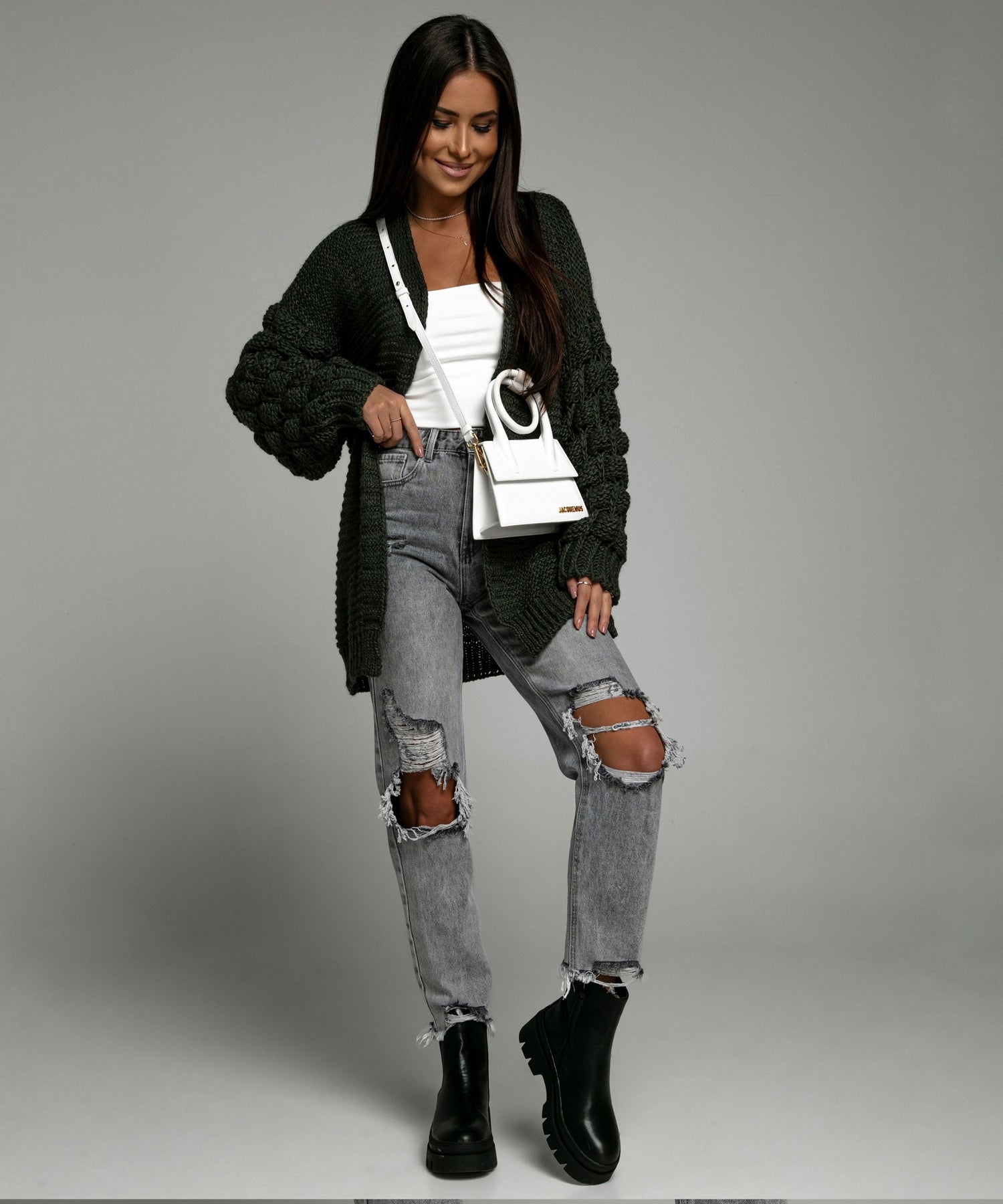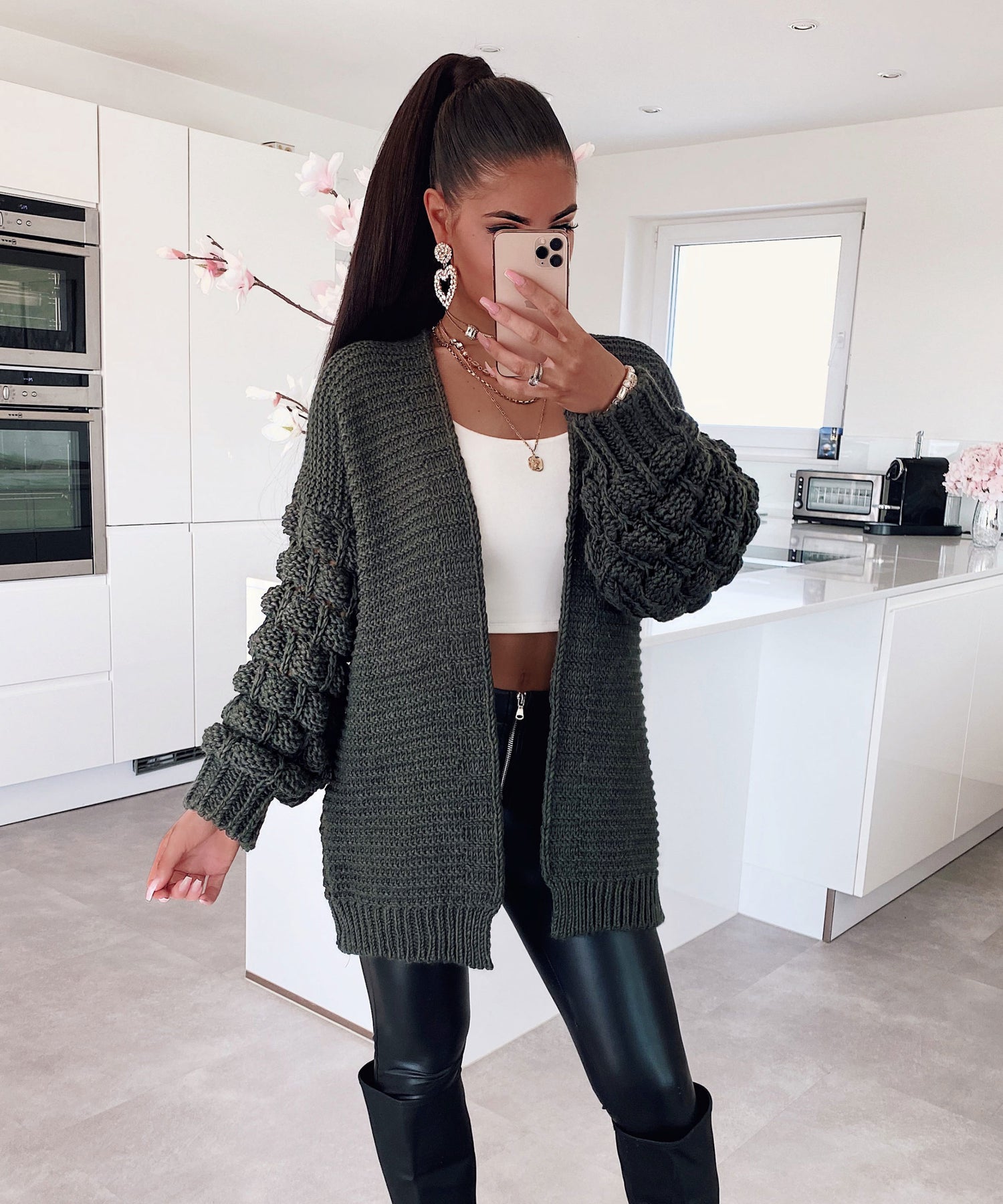 Weiche Jacke aus Strick. Model eins ist 1.69m. Model zwei ist 1.65m. Einheitsgröße passt XS-XL. Länge ca. 78cm