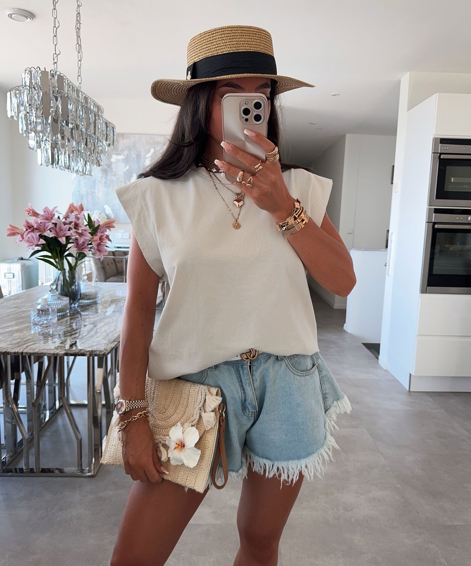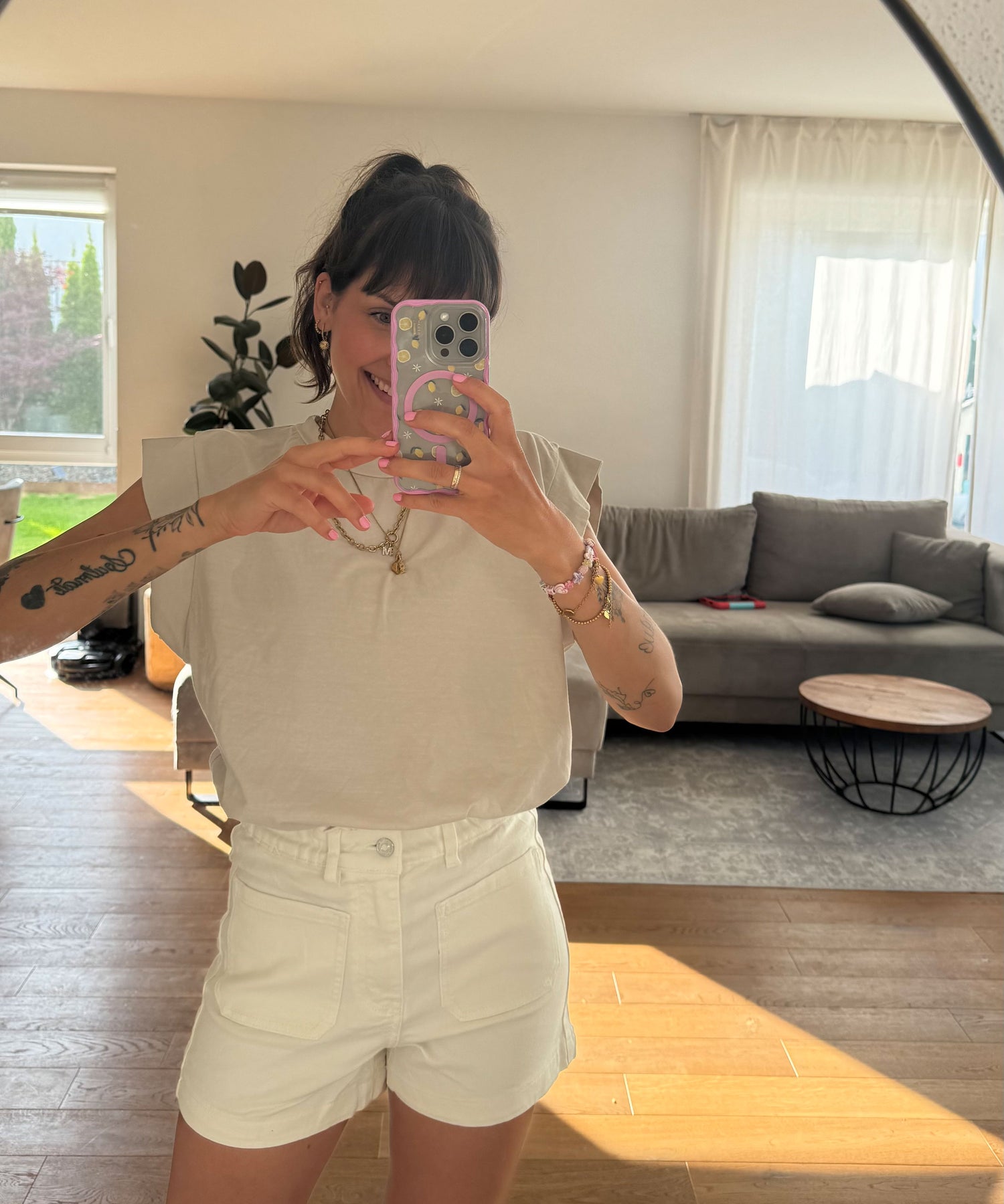 Dehnbares T-Shirt aus Baumwolle. Passt XS-M. Model ist 1,65m groß.