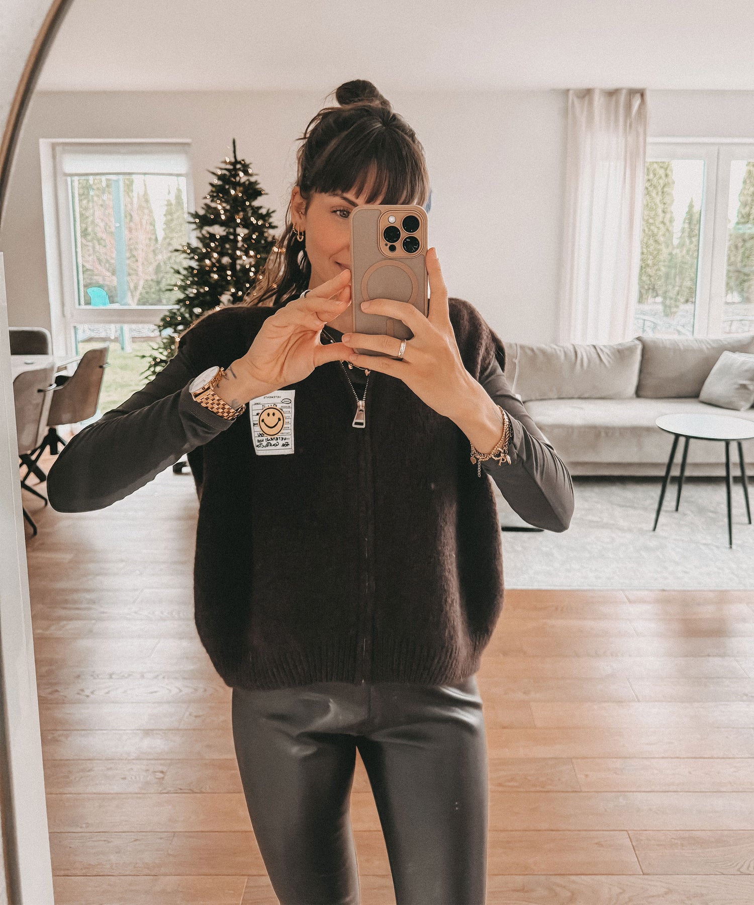 Super weiche Weste. Model ist 1,65m. Passt XS-XL.